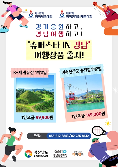 두 번째는 ‘슈퍼스타 in 경남: 이순신장군 승전지 순례길 1박 2일 여행’이다. 이순신 장군의 발자취를 따라 아름다운 풍경을 감상할 수 있는 여행코스다. 서울출발-사천바다케이블카(노량해전)-이순신장군 승전지 순례길 걷기(상족암 코스)-당항포관광지(당항포대첩)-통영 동피랑(통제영), 강주안어시장(개별석식)-통영 숙박–조식-전국장애인체전 경기관람–중식–진해 근대역사거리투어–서울도착. 가격은 성인 14만 9000원이다.