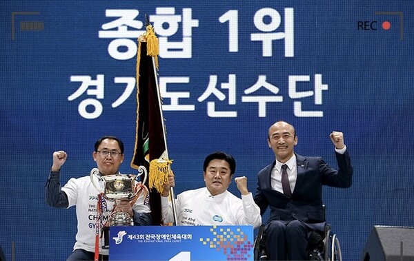 지난해 전남 목포에서 열린 제 43회 전국장애인체육대회에서 대회 3연패를 한 경기도 선수단 대표와 대회장인 대한장애인체육회 정진완회장. ©대한장애인체육회