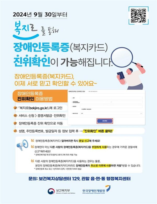 복지로 통해 30일부터 온라인 장애인등록증 진위확인, 장애인등록 가능