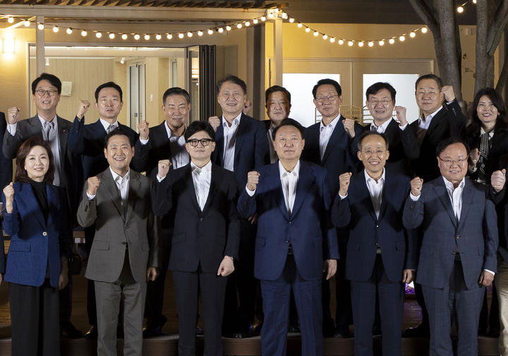 [서울=뉴시스] 조수정 기자 = 윤석열 대통령이 24일 서울 용산 대통령실 앞 분수정원에서 열린 국민의힘 지도부 초청 만찬을 마친 뒤 한동훈 대표, 추경호 원내대표 등 참석자들과 기념촬영을 하고 있다. (사진=대통령실 제공) 2024.09.24. photo@newsis.com *재판매 및 DB 금지
