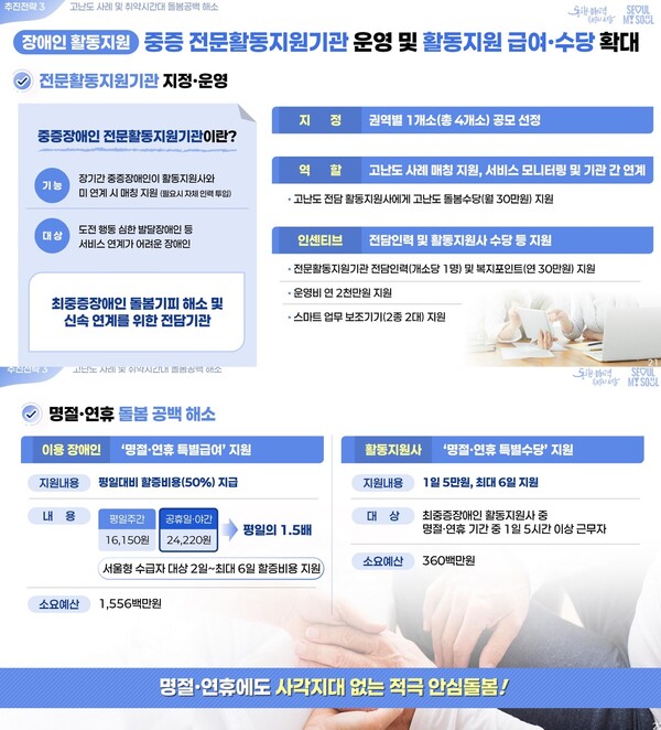 고강도 중증장애인이 명절·연휴에도 서비스를 받도록 서울형 수급자를 대상으로 48~144시간(평일대비 할증 비용 50%)의 ‘명절·연휴 특별급여’도 신설해 부담을 덜어준다. 활동지원사에게도 1일 5만원, 최대 6일까지 특별수당을 지급한다.