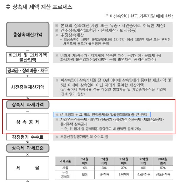 일괄공제=일괄공제는 피상속인이 한국 거주자일 때만 적용하고 위에서 설명한 ‘기초공제’와 ‘그 밖의 인적공제’를 합산한 금액과 5억 원을 비교하여 큰 금액을 상속세 과세가액에서 공제합니다. 다만, 상속세 과세표준 신고를 하지 않는 경우에는 일괄적으로 5억 원을 상속세 과세가액에서 공제하게 됩니다.