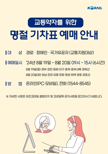 이와 함께 교통약자가 온라인이나 전화로 명절 승차권을 예매하는 방법을 상세히 설명하는 동영상과 안내 포스터를 배포한다.