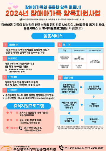 자세한 사항은 부산장복 장애아가족양육지원사업 담당자(051-790-6124~6126, 070-4550-2089)로 문의하면 된다.