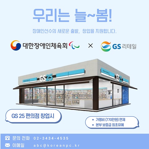 ‘늘봄 창업지원제도’는 대한장애인체육회에 등록된 장애인 선수들이 GS25 편의점을 창업할 경우 가맹비 770만 원을 면제하고 본부 보증금을 최초 유예하는 혜택을 제공하는 것으로 장애인 선수들에게 창업의 장벽을 낮추고, 새로운 시작을 돕고자 마련됐다.