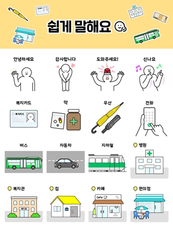 “쉽게 말해요”는 텍스트 대신 이모티콘을 사용해 원하는 메시지를 빠르게 전할 수 있는 것이 특징이다. 구체적으로 도움을 요청하거나 안부, 감정을 표현하는 내용을 비롯해 복지관, 화장실, 우산처럼 생활과 밀접한 단어까지 총 32개 이모티콘으로 구성됐다.