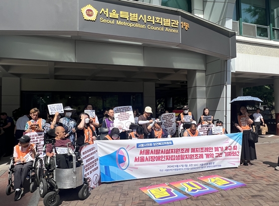 이에 대해 서울장애인차별철폐연대(이하 서울장차연) 등 장애인단체는 17일 오전 기자회견을 열고 탈시설 조례 폐지안이 서울시의회에서 정식 절차를 밟아 폐지가 확정되기도 전 탈시설 조례 폐지를 전제로 하는 조례 개정안을 발의했다고 규탄했다.