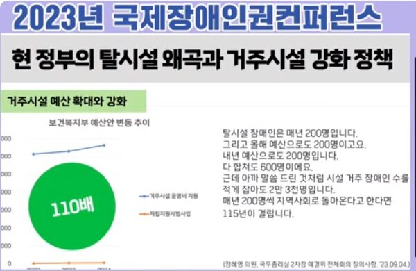 거주시설 중심으로 예산이 배정되는 등 현 정부의 탈시설 왜곡과 거주시설 강화정책을 설명하는 자료. ⓒ한국장애포럼 Youtube 동영상 캡처