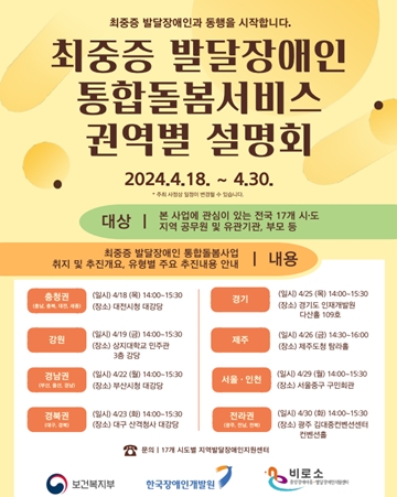 또한 4월 18일부터 30일까지 지방자치단체 현장 설명회가 개최된다. 통합돌봄 사업에 관심 있는 발달장애인 당사자 및 보호자, 수행기관 공모에 참여하고자 하는 발달장애인 서비스 제공기관 등이 참여 가능하다.