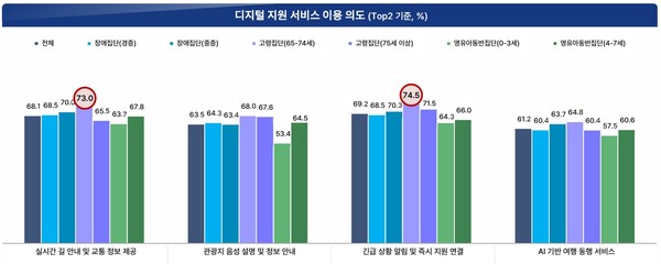 디지털 지원 서비스 이용 의도 분석 결과 긴급 상황 알림 및 즉시 지원 연결(69.2%), 실시간 길 안내 및 교통 정보 제공(68.1%), 관광지 음성 설명 및 정보 안내(63.5%) AI 기반 여행 동행 서비스(61.2%) 순으로 요구도가 높은 편이었다.