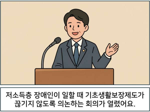2. 회의에서는 저소득층 장애인*이 일할 때 기초생활보장제도*가 끊기지 않도록 의논했어요.