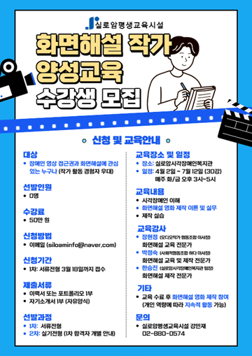 교육 수강료는 50만 원으로 실로암시각장애인복지관에서 4월 2일부터 7월 12일까지(주 2회, 총 30강) 교육이 진행된다. 교육 과정은 시각장애인의 이해와 화면해설 제작 이론 및 실습으로 구성됐으며 실습 때는 개인별 피드백과 보완을 병행할 계획이다.