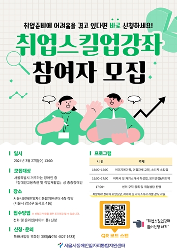 서울장애인일자리지원센터, 중증장애인 대상 ‘취업스킬업강좌’ 참여자 모집