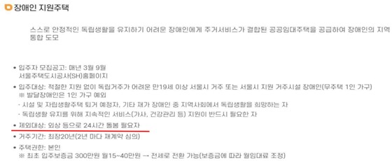 하지만 최근 서울시는 장애인 지원주택 모집공고에서 ‘와상 등으로 24시간 돌봄 필요자’를 입주 제외 대상으로 공고했다.