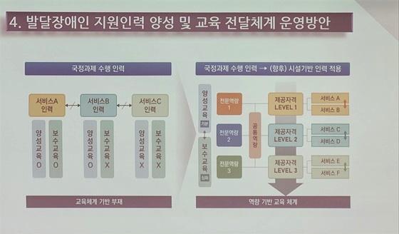 보건복지부 장애인서비스과 김진옥 사무관은 발달장애인 지원인력 교육체계 개편 추진 방향에 대해 “발달장애인 지원인력의 양성 및 보수교육 과정에 대한 타당성 확보를 위해 제공 자격별 지원인력의 필요 역량에 기초한 표준 교육과정 및 가이드를 개발하고 교육기관에서 이를 적용해 교육을 제공할 수 있도록 검토할 예정”이라고 밝혔다.