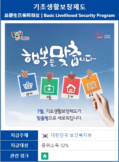 2015년 7월 [국민기초생활보장법](2014. 12. 30)에 의해 맞춤형 급여 형태로 제도가 개편되면서 지원 항목이 생계, 의료, 주거, 교육 중 각 가정의 상황에 맞는 급여를 지급하게 되었다.
