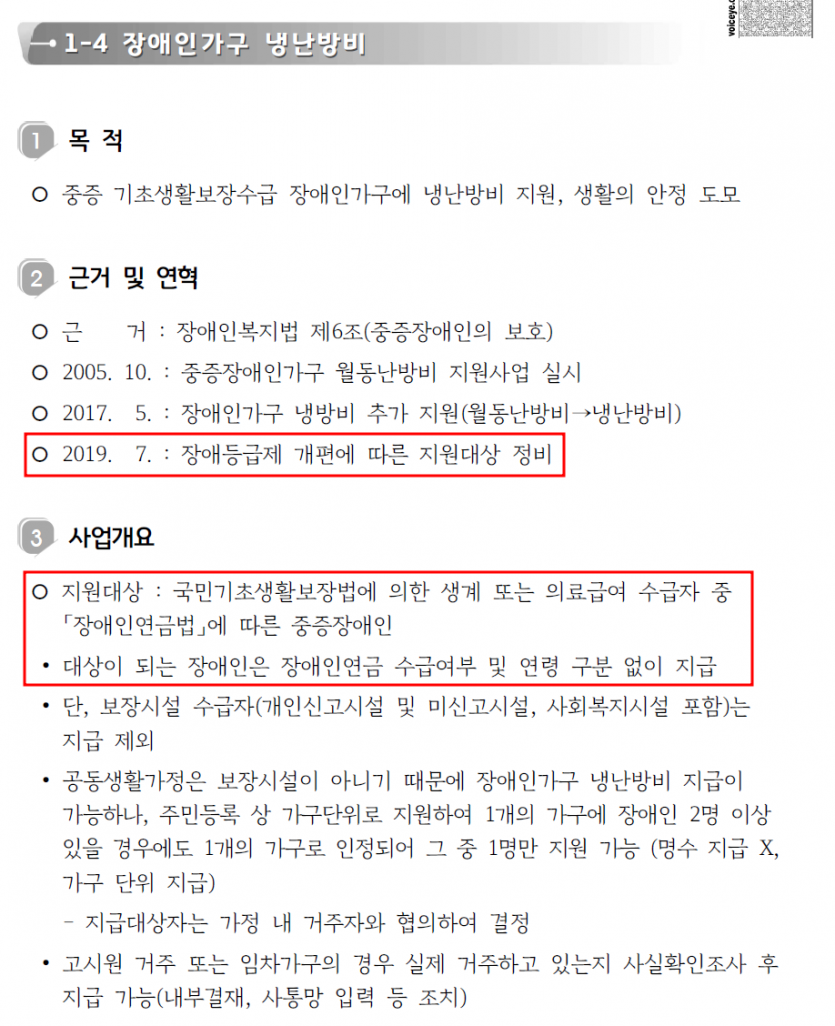 *장애인가구 냉난방비 - 목적: 중증 기초생활보장수급 장애인가구에 냉난방비 지원, 생활의 안정 도모지원 - 대상: 국민기초생활보장법에 의한 생계 또는 의료급여 수급자 중 「장애인연금법」에 따른 중증장애인. ⓒ경기도
