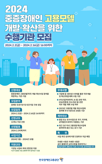 중증장애인 고용모델 개발·확산 사업은 중증장애인의 고용영역, 직무 확대를 위해 민간기업 및 기관이 장애인의 새로운 직무를 개발하고 취업을 통해 직무를 확산하는 민간기업, 기관을 지원하는 사업이다.