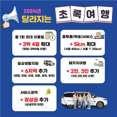 먼저 초록여행 차량 1회 최대 이용일 수가 확대된다. 그간 연간 최대 10일의 범위에서 1회 최대 3일 이용 가능했으나, 일정 추가에 대한 요구를 반영 1회 최대 3박 4일로 확대되는 것으로 당일, 1박 2일, 2박 3일, 3박 4일 선택이 가능하다.