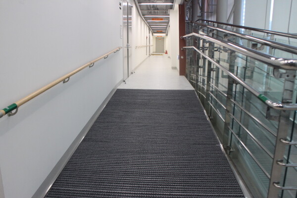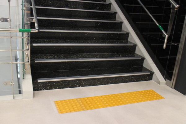 건물 내부 계단 양쪽에는 시각장애인이 손끝으로 만져 층수를 알 수 있는 점자표지판을 부착한 손잡이, 계단 입구 바닥에 점자블록이 양호하게 설치됐다. 반면 미끄럼을 방지하는 계단 논슬립은 황색이 아니라 검은색이어서 저시력 장애인이 구분하기 힘들다.