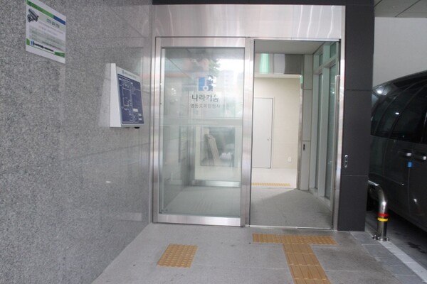 점검결과 1층 주출입문은 자동문 1곳으로 앞바닥에 점자블록이 설치돼 있어 휠체어를 사용하는 장애인이나 시각장애인이 출입하는데 불편을 겪을 것으로 보였다. 이를 해소하려면 터치식자동문이나 자동문 2곳을 각각 설치하고, 한쪽에 시각장애인들의 안전 보행을 위해 점자블록을 설치하면 된다.