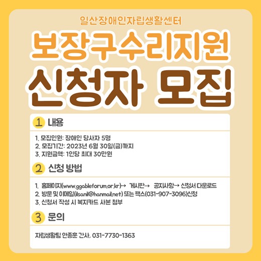 모집인원은 5명으로 장애인 당사자면 누구나 신청 가능하다. 선정될 시 1인 30만 원 내에서 자신이 원하는 보장구 품목을 선택해 지원받을 수 있으며, 보장구 사용법 정부 제공 및 상담도 진행할 예정이다.