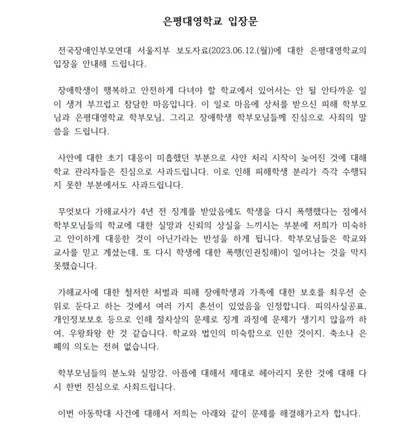은평대영학교 측은 “장애학생이 행복하고 안전하게 다녀야 할 학교에서 있어서는 안 될 안타까운 일이 생겨 부끄럽고 참담한 마음이다. 이 일로 마음에 상처를 받으신 피해 학부모님과 은평대영학교 학부모님, 그리고 장애학생 학부모님들께 진심으로 사죄의 말씀을 드린다”고 전했다.