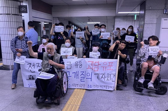 전장연은 13일 오전 8시 서울 시청역에서 ‘전장연 보조금 유용 괴담 유포에 대한 서울시 공개 질의 기자회견’을 개최했다.