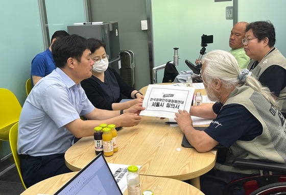 한편 기자회견을 마친 전장연 박경석 상임대표, 서울시장애인자립생활센터협의회 이형숙 회장, 서울장애인차별철폐연대 이규식 대표 등 대표단은 서울시와 면담을 진행한 뒤 질의서를 전달했다.