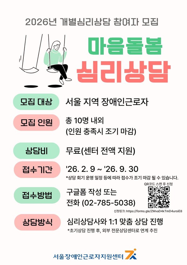 【에이블뉴스 이슬기 기자】서울장애인근로자지원센터가 서울 지역 장애인근로자의 심리·정서적 안정을 지원하기 위한 ‘마음돌봄 심리상담’ 참여자를 9월까지 상시모집한다고 9일 밝혔다.