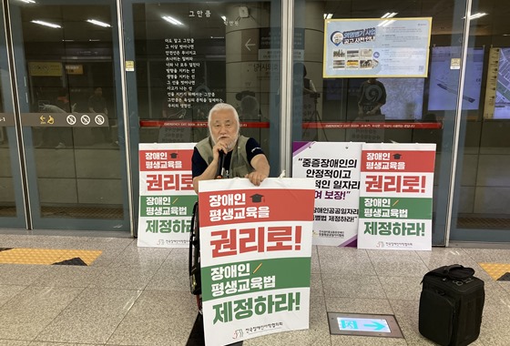 5일 오전 8시 서울 국회의사당역에서 열린 358일차 지하철선전전에서 발언하는 전국장애인차별철폐연대 박경석 상임공동대표. ⓒ전국장애인차별철폐연대