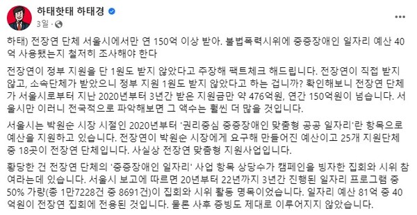 이어 “전장연 단체의 '중증장애인 일자리' 사업 항목 상당수가 캠페인을 빙자한 집회와 시위 참여라는데 있다. 서울시 보고에 따르면 2020년부터 2022년까지 3년간 진행된 일자리 프로그램 중 50% 가량이 집회와 시위 활동 명목이었다. 일자리 예산 81억 중 40억 원이 전장연 집회에 전용된 것. 물론 사후 증빙도 제대로 이루어지지 않았다”고 지적했다.