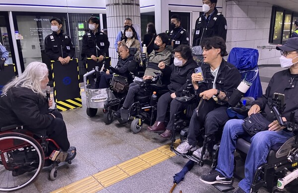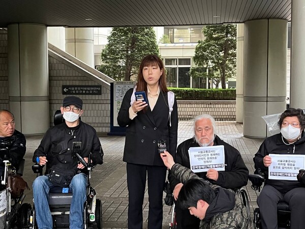 이어 전장연은 서울중앙지법 앞에서 서울교통공사 손해배상 소송 재판을 앞두고 입장발표 기자회견까지 이어갔다.