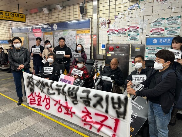 전국장애인차별철폐연대(전장연)이 6일 서울지하철 4호선 혜화역 5-4승강장(동대문 방면)에서 기자회견을 열고, “장애인 음식점 이용 거부는 차별”이라면서 장애인차별금지법 실효성 강화를 촉구했다.ⓒ전국장애인차별철폐연대