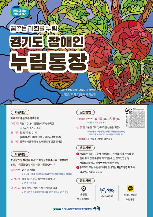 경기도가 중증장애인이 월 10만 원을 저축하면 10만 원을 추가 지원해 2년 만기 시 약 500만원을 마련할 수 있는 ‘장애인 누림통장’ 대상을 만 19세에서 만 19세(2004년생)부터 21세(2002년생)까지로 확대했다고 4일 밝혔다.