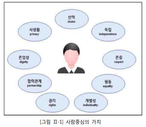 이 보고서는 우리 실정에 맞는 장애인중심서비스 지원의 가이드라인을 구축해 장애인 당사자가 사회 구성원으로서 지역사회에 통합될 수 있도록 지원하고자 장애인중심지원 실천의 개념과 이에 따른 자기주도 활동 지원방안 등을 제시했다.