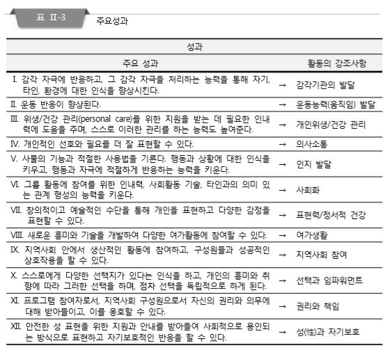 철학을 설정하면 담당자는 이용인 개인에 대한 주요 목표나 성과를 결정해야 한다. 활동 메뉴에 반영될 만한 주요성과는 ▲감각 자극에 반응하고 처리하는 능력 향상 ▲운동 반응 향상 ▲위생과 건강 관리 ▲사물의 기능과 적절한 사용법 등 12가지가 있다.