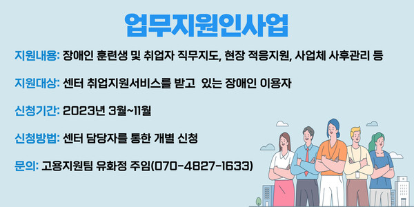 ‘업무지원인사업’은 센터를 통해 취업 후 직장 내 업무적응에 어려움을 겪거나 고충 및 문제 상황 등 현장에서 발생하는 애로사항을 해결하기 위해 현장에 업무지원인을 배치해 취업지원서비스를 제공하는 사업이다.
