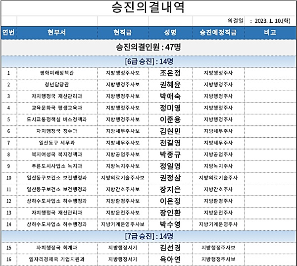 【고양인터넷신문】고양시가 지난달 5급(과장) 승진대상자 12명에 대한 사전의결에 이어 1월 10일자로 6급 14명, 7급 14명, 8급 19명 등 총 47명의 ‘2023년 상반기 후속인사’ 승진의결을 발표했다. 다음은 상반기 승진의결 내용이다.