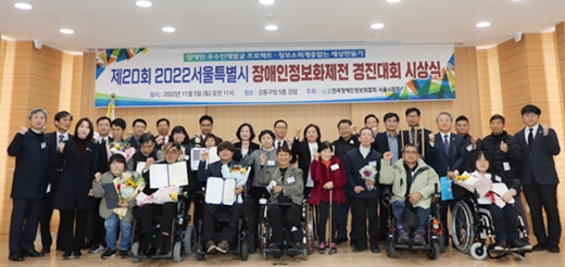 지난 5일 서울 강동구청 5층 강당에서 ‘2022 서울특별시 장애인정보화제전’ 시상식을 마친 뒤 기념촬영 모습. ⓒ서울특별시 장애인정보화협회 에이블포토로 보기▲ 지난 5일 서울 강동구청 5층 강당에서 ‘2022 서울특별시 장애인정보화제전’ 시상식을 마친 뒤 기념촬영 모습. ⓒ서울특별시 장애인정보화협회