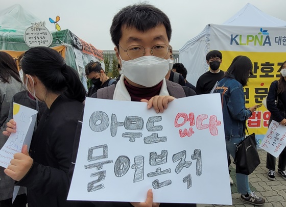 ‘아무도 물어본적 없다’ 피켓을 들고 있는 피플퍼스트서울센터 박현철 센터장. ⓒ에이블뉴스 에이블포토로 보기▲ ‘아무도 물어본적 없다’ 피켓을 들고 있는 피플퍼스트서울센터 박현철 센터장. ⓒ에이블뉴스