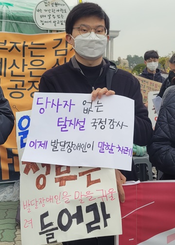‘당사자 없는 탈시설 국정감사 이제 발달장애인이 말할 차례’ 피켓. ⓒ에이블뉴스 에이블포토로 보기▲ ‘당사자 없는 탈시설 국정감사 이제 발달장애인이 말할 차례’ 피켓. ⓒ에이블뉴스