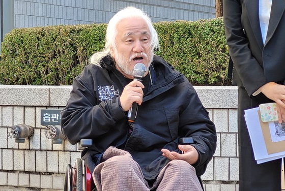 18일 오전 1심 판결 이후 서울중앙지방법원 앞에서 발언하는 전국장애인차별철폐연대 박경석 상임공동대표.ⓒ에이블뉴스 에이블포토로 보기▲ 18일 오전 1심 판결 이후 서울중앙지방법원 앞에서 발언하는 전국장애인차별철폐연대 박경석 상임공동대표.ⓒ에이블뉴스