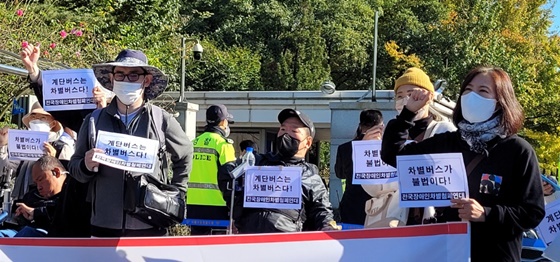 ‘계단버스는 차별버스다’, ‘차별버스가 불법이다’ 피켓을 든 장애인 당사자와 활동가들. ⓒ에이블뉴스 에이블포토로 보기▲ ‘계단버스는 차별버스다’, ‘차별버스가 불법이다’ 피켓을 든 장애인 당사자와 활동가들. ⓒ에이블뉴스