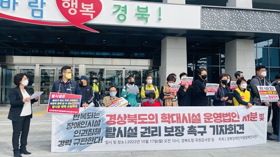 한편 경북장애인차별철폐연대는 17일 경북도청 국정감사 시작과 함께 국정감사장 앞에서 반복되는 장애인시설 인권침해를 강력하게 규탄하며, 경상북도 학대시설 운영법인 처분 및 탈시설 권리보장을 촉구하는 기자회견을 개최했다.