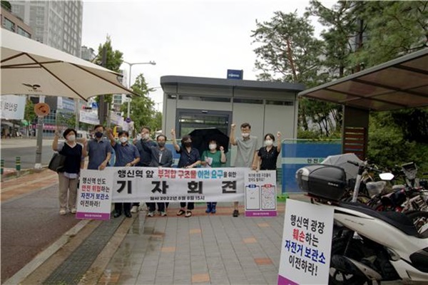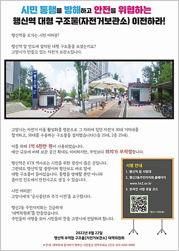 대책위는 “행신역 앞은 KTX 역을 이용하는 시민들에게도 다소 좁은 곳이며, 인도와 횡단보도가 만나는 곳”이라며 “이런 곳에 대형 구조물이 들어서면 인도와 횡단보도, 자전거보관소를 이용하는 시민들의 동선이 얽혀 통행을 방해받고 행인과 자전거, 킥보드 등이 부딪혀 사고의 위험도 매우 크다”고 주장했다.