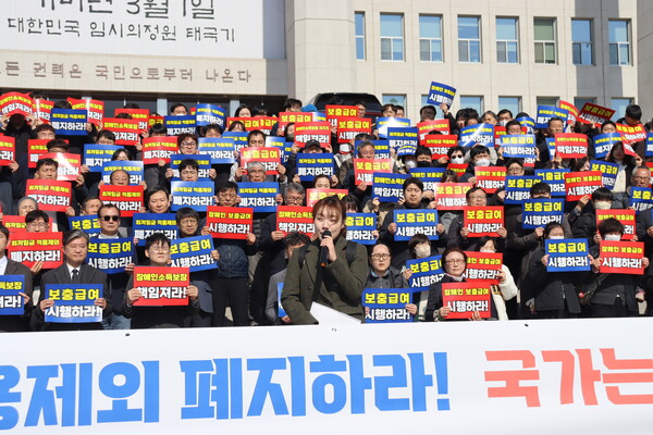 한국장애인직업재활시설협회 ‘장애인 최저임금 적용제외 폐지 및 보충급여 도입 비상대책위원회’(이하 비대위)가 지난 13일 국회 본관 앞에서 결의대회를 개최하고, 현행 장애인 최저임금 적용제외 제도의 폐지와 그 대안으로 ‘장애인 보충급여 제도’ 도입을 정부와 국회에 강력히 촉구했다.ⓒ한국장애인직업재활시설협회