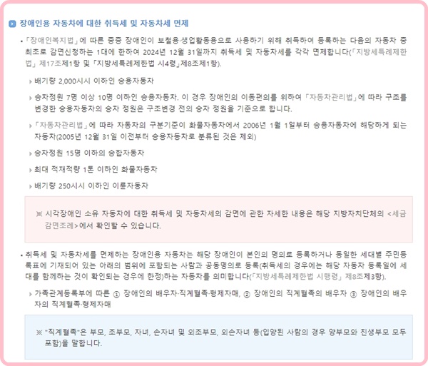"장애인복지법에 따른 중증 장애인이 보철용·생업활동용으로 사용하기 위해 취득하여 등록하는 다음의 자동차 중 최초로 감면 신청하는 1대에 한하여 2024년 12월 31일까지 취득세 및 자동차세를 각각 면제합니다(지방세특례제한법 제17조제1항 및 지방세특례제한법 시행령 제8조제1항)."