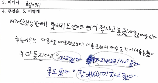 청각장애 교사의 수업 도중 비하하고 욕설한 학생의 사안 진술서 일부. ⓒ에이블뉴스 에이블포토로 보기▲ 청각장애 교사의 수업 도중 비하하고 욕설한 학생의 사안 진술서 일부. ⓒ에이블뉴스