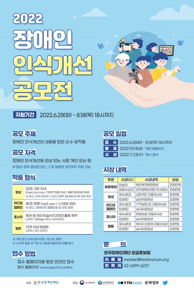 참여는 장애인 인식개선에 관심을 가진 개인 또는 팀으로, 장애인 인식개선을 주제로 한 순수 창작물을 영상·라디오캠페인·포스터·웹툰 총 4개 부문에 걸쳐 접수 홈페이지에서 지원할 수 있다.